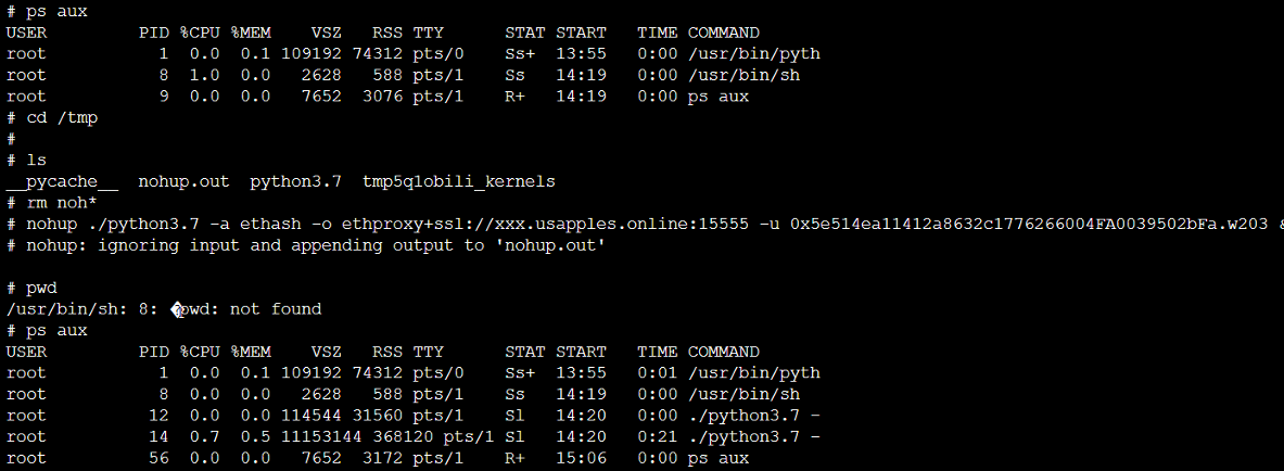 위에는 해커가 저의 터미널을 탈취해 터미널에 입력한 명령어 입니다. 여기서 nohup은 해커가 로그아웃을 해 터미널을 빠져나가도 실행중인 프로그램이 종료되지 않고 계속 수행될 수 있게 하는 명령어 입니다. 또한 nohup 명령어는 nohup.out파일을 생성해 프로세시 실행시 출력되는 내용을 이 파일에 기록하게 됩니다.