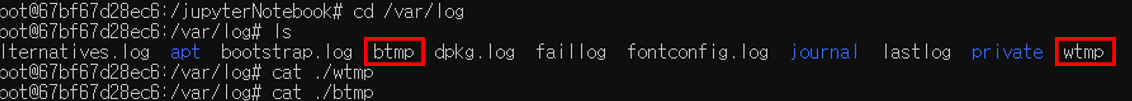 btmp : 실패한 로그인 정보를 담고 있는 로그파일, /var/log/btmp