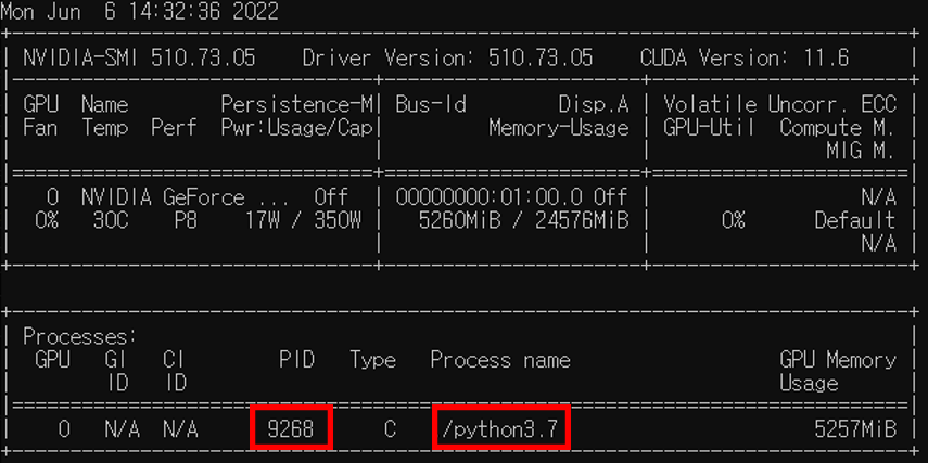 올해 2022년 6월 5일 서버의 GPU가 100% 가동되는 상황 목격했습니다. nvidia-smi 명령어로 어떤 프로세스가 돌아가고 있는 지 확인 해 보왔습니다.