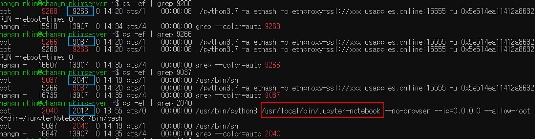파란색 박스는 프로세스 바로 위에 있는 부모 프로세스를 의미 하며, 이런식 으로 다음 부모 프로세스를 찾아 가면서 최종으로 최상위 부모 프로세스를 찾으려고 했습니다. 최상위 부모 프로세스를 확인 하면서 동시에 문제의 구간을 찾았습니다. 위에 빨간 색 박스는 악성 프로세스가 주피터 노트북에서 실행된다는 것을 나타냅니다. 저는 주피터 노트북을 docker를 통해서 실행하고 있어서 호스트 영역에서 프로세스가 발견 되지 않은 거 같습니다. 그러면 일단 주피터 노트북에 접속해서 악성 프로세스가 실행 중인지 확인 해보겠습니다.