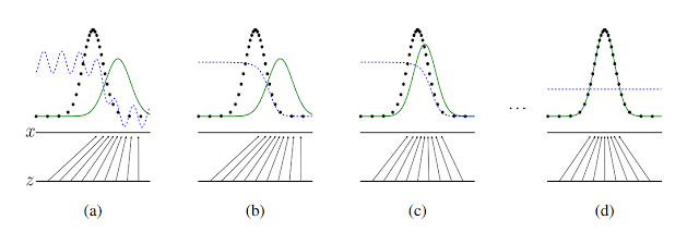 - (b): a상태에서 discriminator가 두 discribution(분포)을 구별하기 위해 학습을 하면 위의 그림처럼 smooth하고 잘 구별하는 distibution이 만들어진다.
