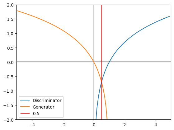 - 여기서 0.5 즉 50%의 확률의 의미는 위조 지폐가 진짜와 구별되지 않는 다는 것을 의미한다.