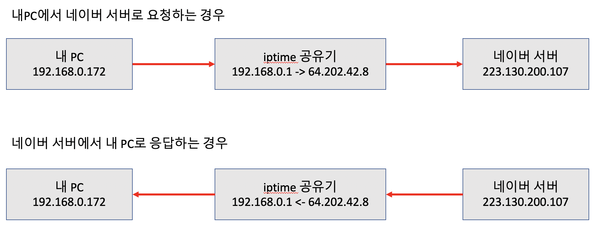내 pc(주소: 192.168.0.172)가 iptime 공유기(192.168.0.1,게이트웨이)로 네이버에게 보낼 데이터를 보내줍니다. 데이터를 받은 공유기는 주소를 64.202.42.8로 해서 네이버 서버(223.130.200.107)에게 데이터를 보내집니다. 반대로 네이버 서버가 내 pc로 데이터를 보낼 때, 내 PC로 보낼 데이터를 iptime 공유기(64.202.42.8)로 보냅니다. 데이터를 받은 iptime 공유기는 192.168.0.1주소로 내 pc에게 데이터를 보내줍니다. 서버가 아닌 대부분의 컴퓨터는 위와 같은 방식으로 네트워크를 구성하게 됩니다.