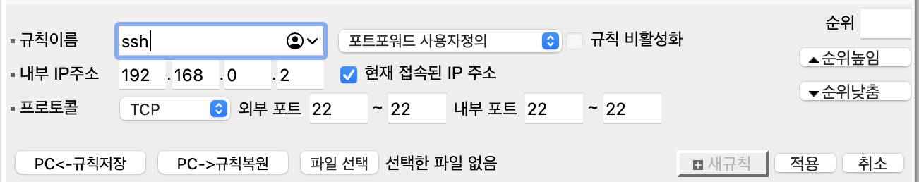 ssh 같은 경우 위와 같이 설정 해주면 됩니다. 여기서 규칙이름은 아무 이름이나 하시면 됩니다. 외부포트와 내부포트로 나뉘는 이유는 보안 차원으로 합니다. 왜냐하면 HTTP, SSH 같은 대중적인 port 번호는 해커의 위험에 노출되기 쉽습니다. 그래서 외부에서 접속하는 포트 번호와 내부포트가 다르게 합니다. ssh뿐만 아니라 서버에서 쓰는 다른 포트도 위와 같이 하시면 됩니다.