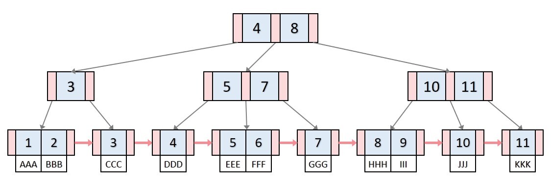 - 범위 검색의 효율성 향상: B+ 트리는 리프 노드에만 데이터를 저장하고 내부 노드는 키만을 저장하므로 범위 검색이 매우 효율적이기 때문에 대용량 데이터 색인에 용이
