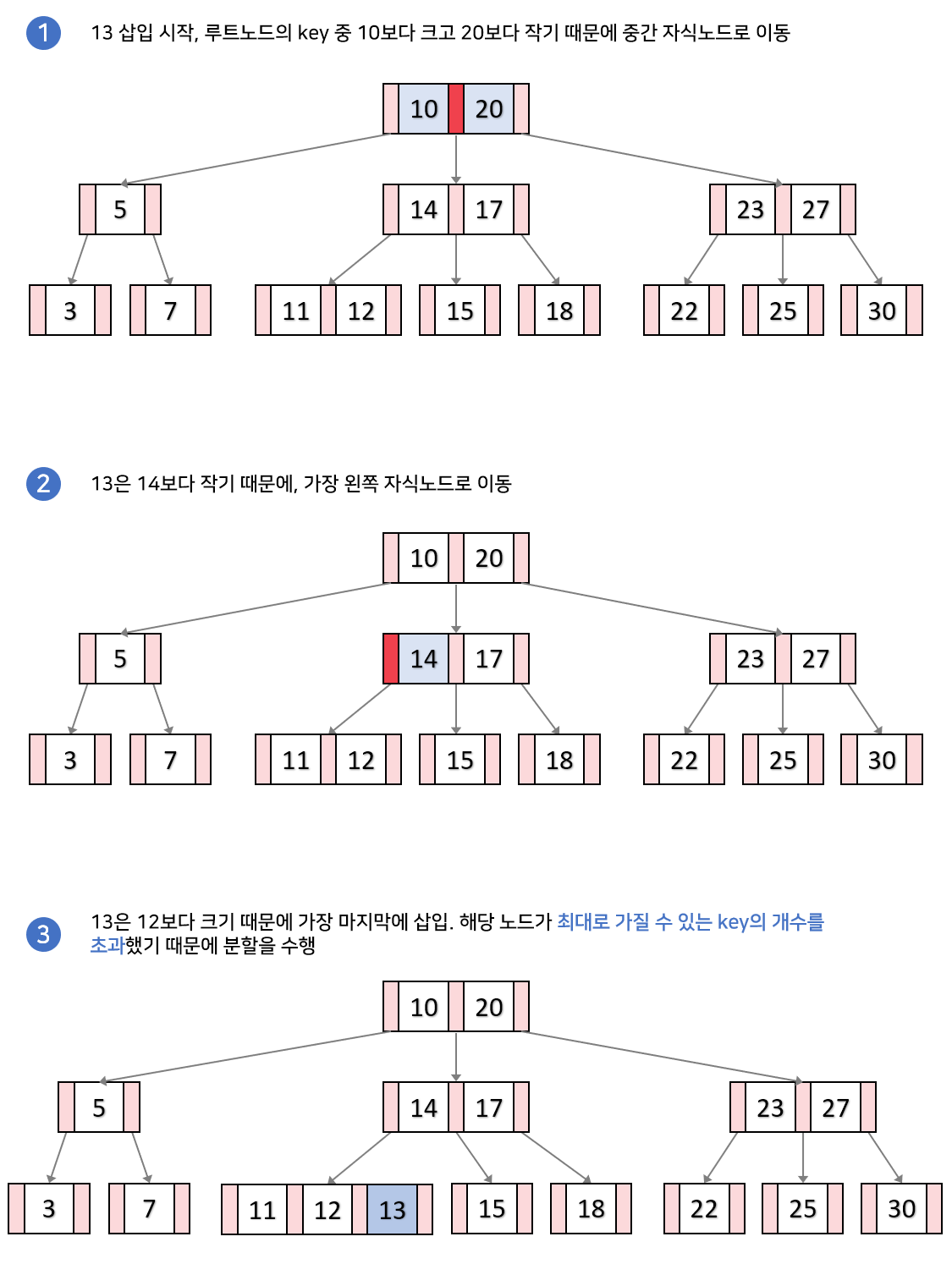 - 삽입 과정에서 노드 분할은 리프노드 검색과 달리 하향식이 아니 상향식으로 이루어집니다.