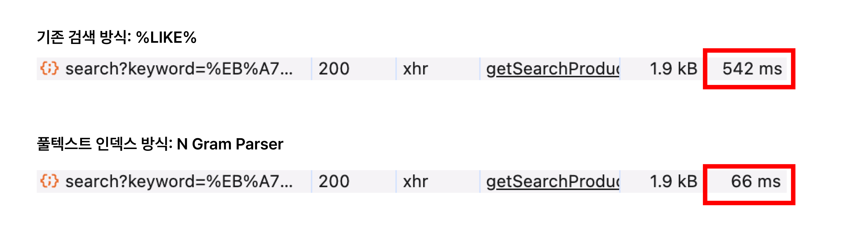 - 풀텍스트 인덱스 검색 방식을 사용해서 기존 %LIKE% 검색 알고리즘 대비 약 87.8%의 성능 향상