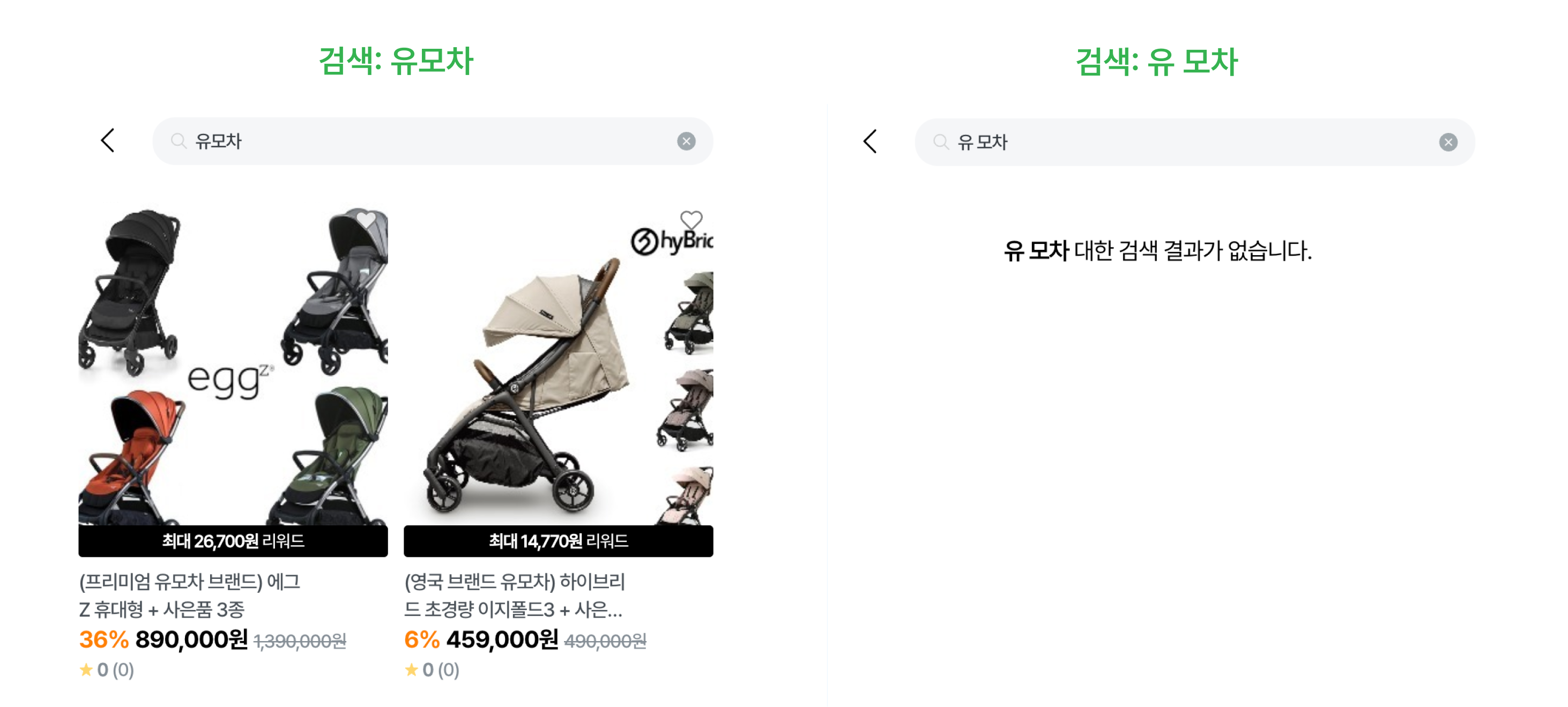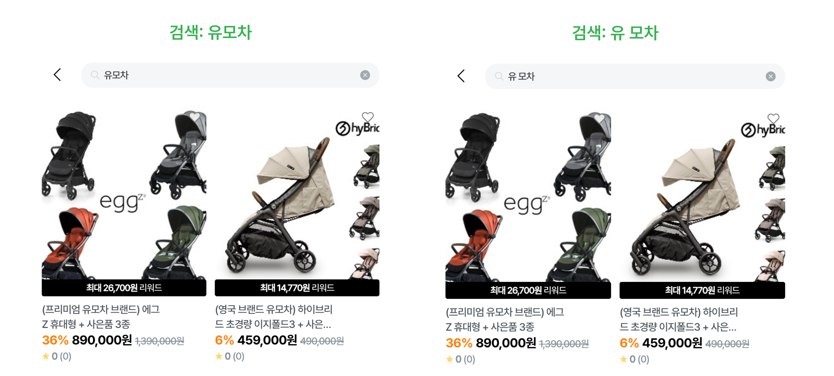%LIKE% 검색의 경우 문자열이 정확히 일치해야 하기 때문에, “유모 차”와 “유모차”를 다른 단어로 인식합니다.