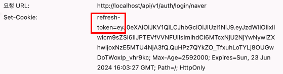 서버의 응답값에 refresh 쿠키가 잘 전달 됐는 지 확인