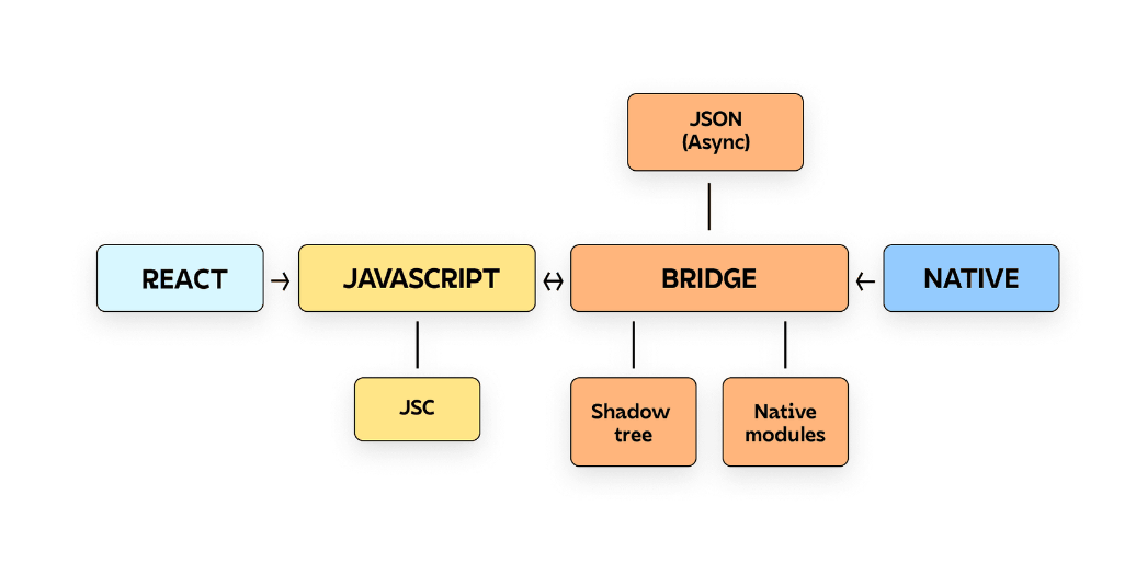 - 리액트 네이티브는 네이티브 프레임워크와 자바스크립트 엔진 간의 통신을 하게 되는 데, 이러한 방식을 브릿지 방식이라고 합니다.